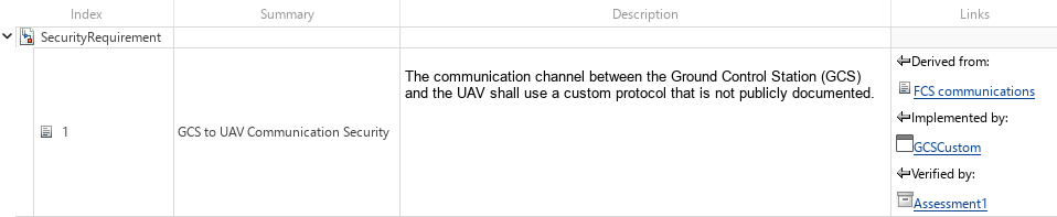 The threat simulation demonstrates that MAVLink’s openly documented message format leaves the communication channel vulnerable to spoofing. This drives the introduction of the following security requirement: "The communication channel between the Ground Control Station (GCS) and the UAV shall use a custom protocol that is not publicly documented." This requirement is stored in SecurityRequirement.slreqx, as shown below: