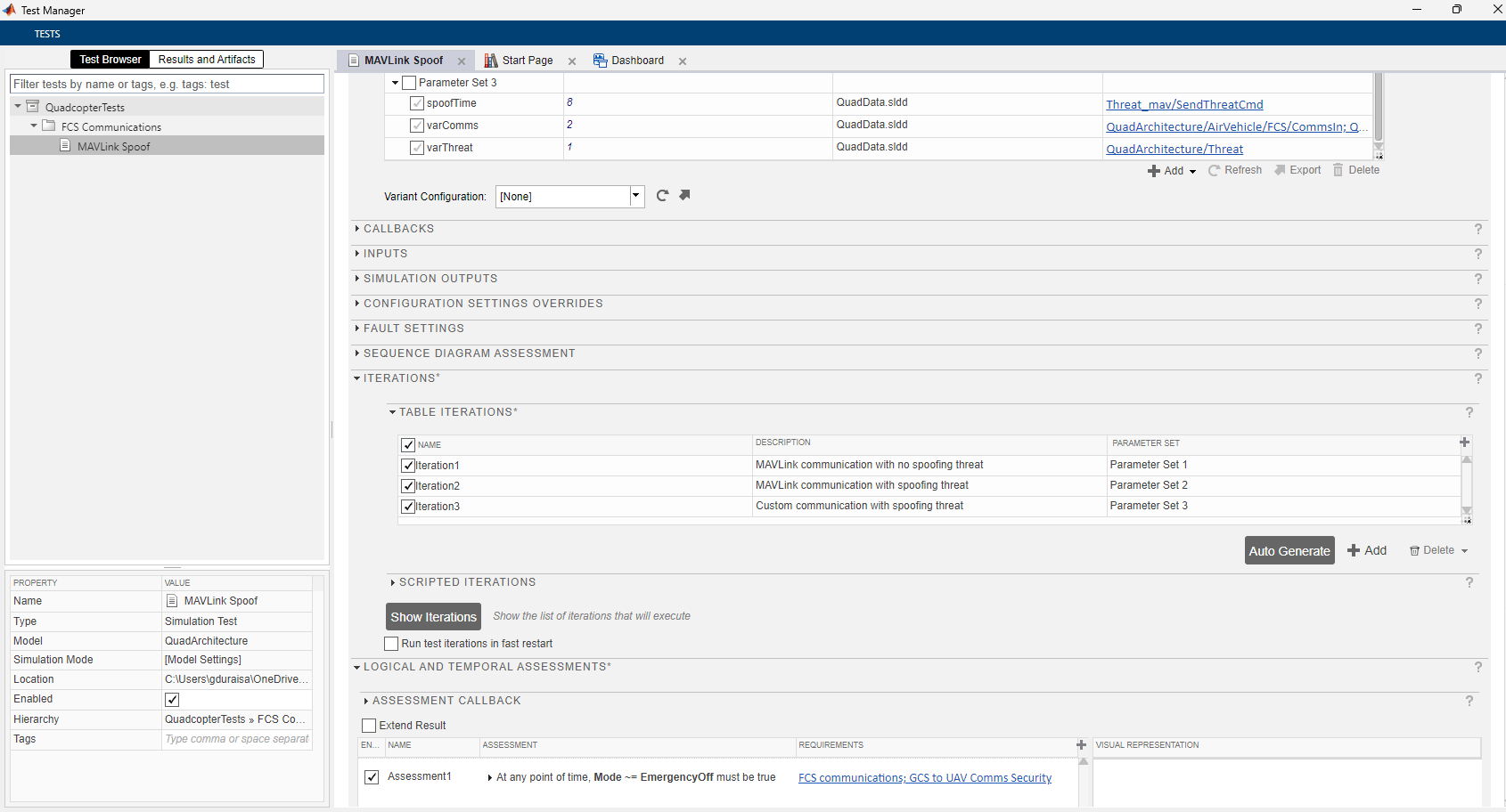 Parameter values for each iteration are set in the Parameter Overrides section of the Test Manager. All three iterations are evaluated using a common assessment to verify that the Mode signal of the quadcopter never equals EmergencyOff at any point during the simulation. This assessment is defined in the Logical and Temporal Assessments section and is linked to the security requirement.