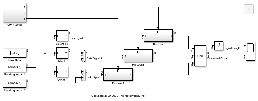 该模型对应于一个假设的系统,其中信号的长度随时间而调整。在任何给定的时间点,尺寸选择子系统根据控制信号值的范围将信号长度设置为三、六或九个元素。