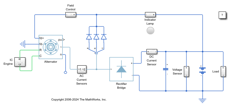 仿真的系统由几个组件组成。主要动力源是驱动交流发电机轴的内燃机(IC)。交流发电机产生交流电。二极管三重奏将交流发电机产生的交流电整流为施加到交流发电机磁场的直流电。当系统打开并且交流发电机未产生电力时,指示灯亮起。整流桥将交流电能转换成直流电能。平滑电容器、电压传感器、电池和车辆负载连接到直流母线。