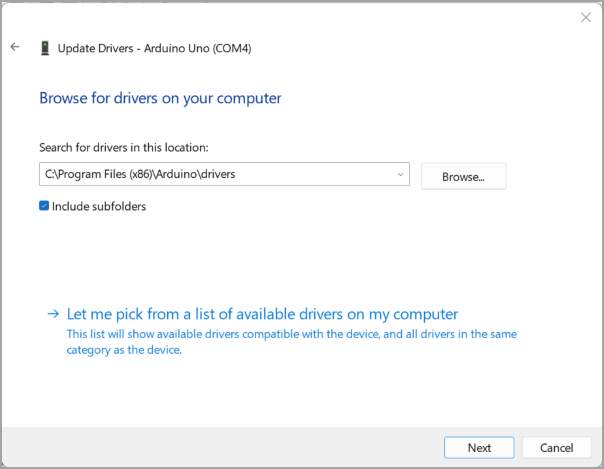 输入计算机中 Arduino 驱动程序的路径。例如,如果位置在