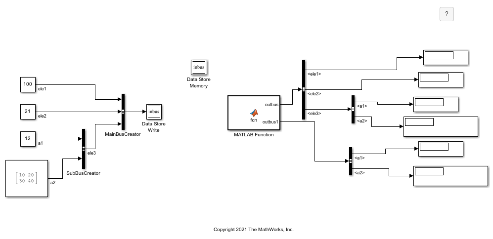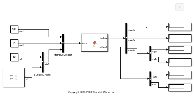 MATLAB Function 可以检索和输出 Simulink® 总线。当您将总线连接到 MATLAB Function 模块时,该模块会将该信号与一个结构体相关联。有关在 MATLAB Function 模块中创建结构体的详细信息,请参阅在 MATLAB Function 模块中创建结构体。您还可以从 Data Store Memory 模块中检索总线数据。有关使用总线和 Data Store Memory 模块的详细信息,请参阅包含总线和总线数组的数据存储。