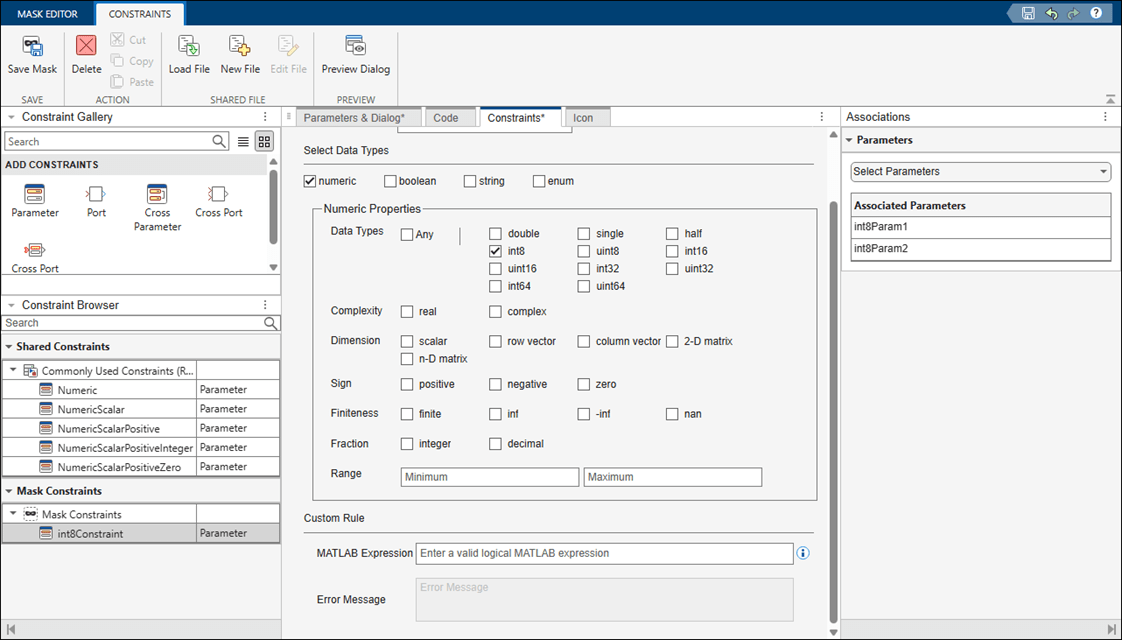 5. To associate the constraint with the parameter, in the Parameters section of Associations pane, select the parameters int8Param1 and int8Param2. You can also associate a parameter to a constraint on the Parameters & Dialog tab by selecting the constraint in the Constraints list.
