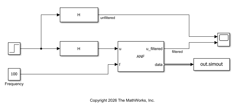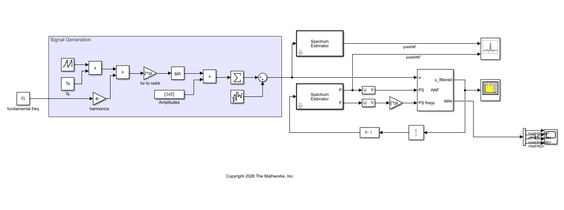The model is configured to simulate a step response of the filtered and unfiltered plant output. The initial value of the Step block is set to 1 and the step occurs at 15 seconds. In this configuration, the input u of the ANF block is connected to the signal you want to filter, and PS and PS freqs are connected to the power spectrum and corresponding frequencies (in rad/s), obtained using the Spectrum Estimator block. Open the model.