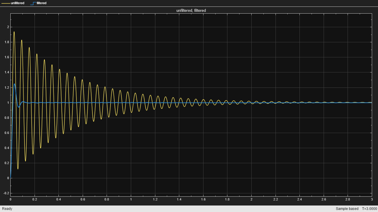 Simulate the model and display the unfiltered and filtered step response of the transfer function.