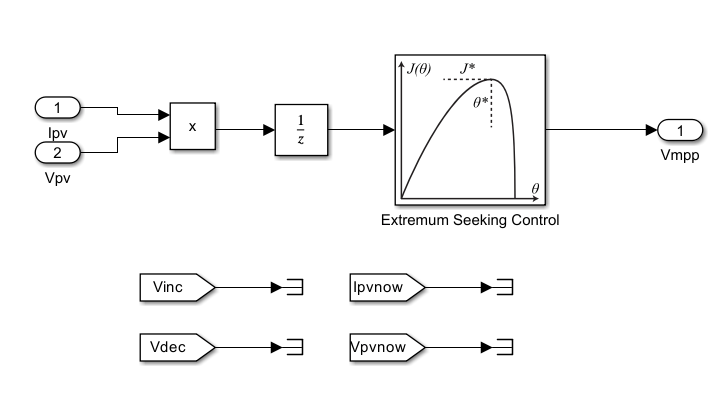 To achieve a satisfactory control performance, an extremum seeking controller adjusts the control parameters to maximize an objective function in real time. This example uses an objective function of instantaneous power from the solar PV, which depends on the current and voltage .