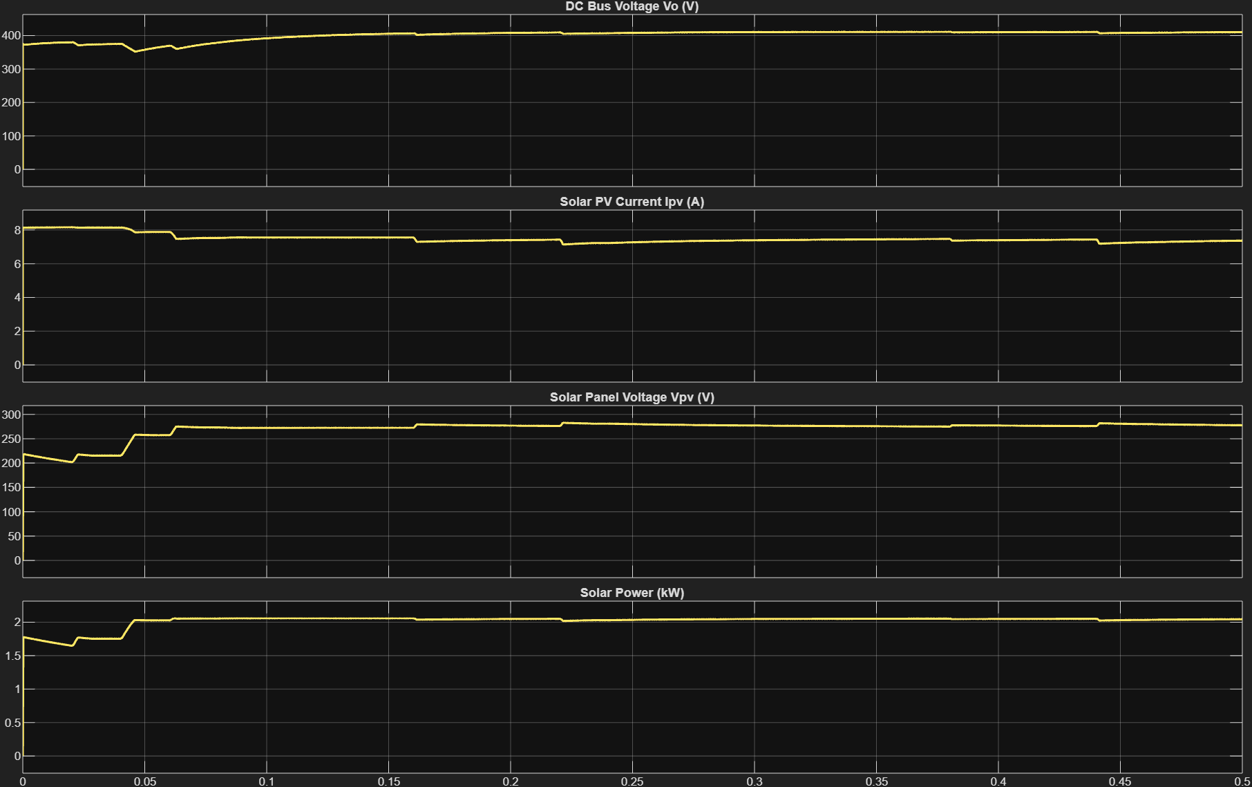 run('ESCSolarPVMPPTBoostData');*********************************************************************************************** **** PV Plant Parameters for the Specified Solar Panel **** *********************************************************************************************** *** Power rating input from the user = 2.00 kW *** Minimum number of panel required per string = 8 *** Maximum number of panel connected per string without reaching maximum voltage = 10 *** Minimum power rating of the solar PV plant = 1.80 kW *** Maximum power possible per string without reaching maximum DC voltage = 2.25 kW *** Actual number of panel per string = 9 *** Number of strings connected in parallel = 1 *** Actual solar PV plant power = 2.03 kW ***********************************************************************************************