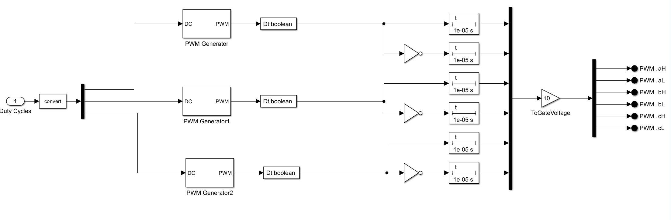 The baseline model does not contain any sources of distortion typically found in the real world such as magnetic saturation, motor winding asymmetry, dead time, and so on. To add distortion to the model, the example adds a delay time for enabling the IGBT switches to simulate dead-time. The higher this value of delay time, the more the distortion. This example uses a value of 10 microseconds which results in 5th and 7th harmonic distortion and a total harmonic distortion of almost 10%. The goal is to reduce these harmonics for various motor speeds and improve the total harmonic distortion.