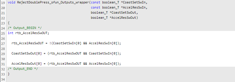 enum = slcoverage.SFcnSelectorType.SFcnInstanceCppConditionOutcome; SFunID = Simulink.ID.getSID([modelName, '/RejectDoublePress']); sel = slcoverage.SFcnSelector(enum,SFunID,'RejectDoublePress_sfun_wrapper.c',... 'RejectDoublePress_sfun_Outputs_wrapper','rtb_AccelResSwOUT && CoastSetSwIn[0]',1,1,2);