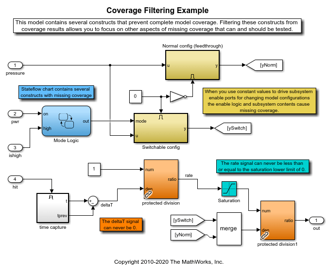 此示例使用 slvnvdemo_covfilt 模型,该模型包含从覆盖率结果中过滤出来的常见模式示例。
