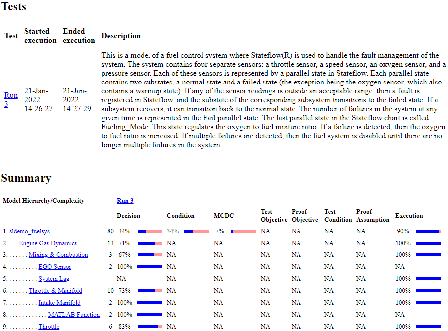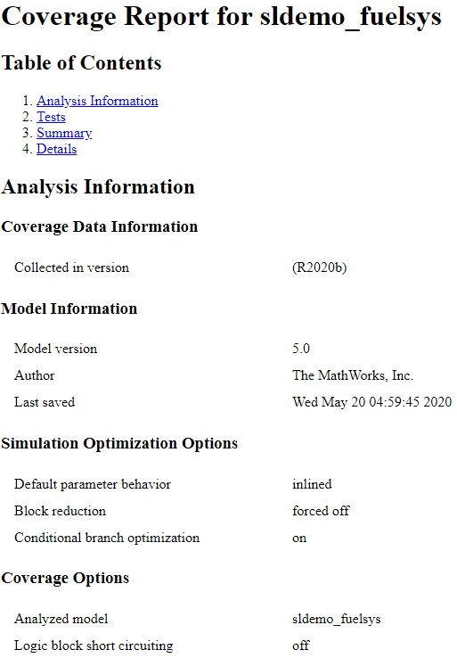 如果您使用运行按钮分析模型的覆盖率,Simulink® Coverage™ 将为名为 的指定模型创建模型覆盖率报告。模型覆盖率在覆盖率详细信息窗格中打开,包含几个部分:model_name_cov.html