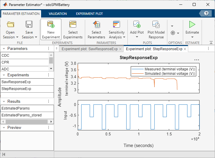 In this example, the saved session estimates the model parameters by fitting the model response to the measured data from two experiments. The StepResponseExp experiment uses an alternating stepped response current profile and the SawResponseExp experiment uses a truncated sawtooth current profile. The current profiles and the corresponding measured data in the two experiments are hypothetical. It is usually necessary to carefully design a current profile such that the measured voltage encodes enough information for estimating battery model parameters.