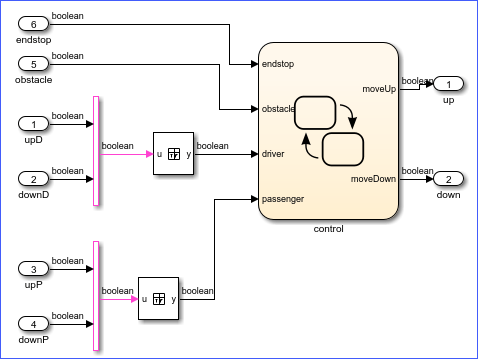 该模型引用指向模型 sldvdemo_powerwindowController,该模型通过发出上下移动车窗的命令来响应驾驶员和乘客的命令。如果车窗遇到障碍物或到达窗框的任意方向的末端,该模型也会做出响应。