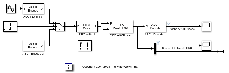 Switch 模块在连续采样时间间隔中,在消息的首尾部分之间交替切换。这模拟了最坏的情况:模型在消息构建完成之前就进行了更新。因此,有时只能收到部分信息。第二个脉冲发生器交替启用和禁用 FIFO Read HDRS 模块。