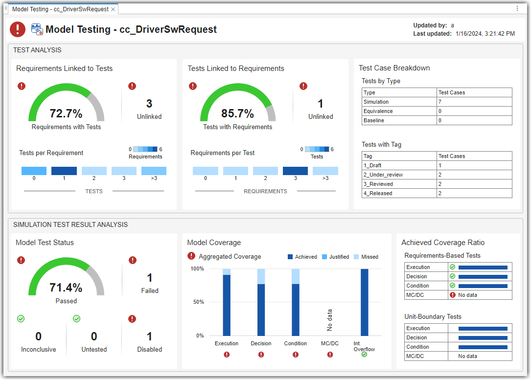 对于单元 cc_DriverSwRequest,仪表板的模型测试状态部分显示在最近的测试运行期间有一项测试失败并且有一项测试被禁用。