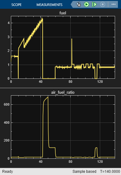 此示例使用汽油发动机的燃油速率控制器模型。控制器使用系统中的四个传感器来确定适当的燃料率。该系统使用的四个传感器是节气门角度、速度、EGO 和歧管绝对压力 [MAP]。