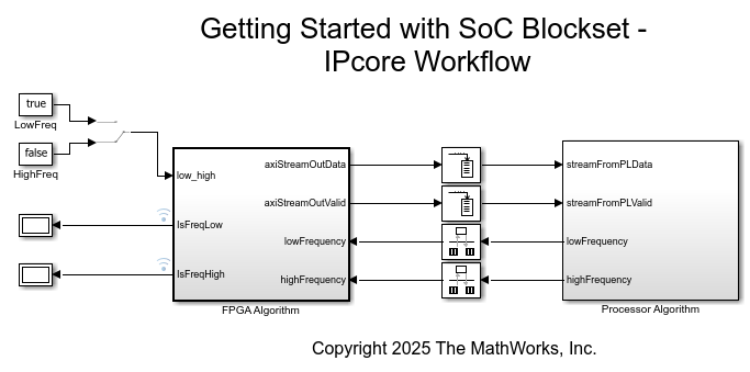 This example shows how to get started with deploying an algorithm on an SoC hardware board using MATLAB® and Simulink® with SoC Blockset™. This example deploys a single algorithm using two distinct workflows: the IP core generation workflow and the SoC builder workflow. This step-by-step approach helps you choose the workflow that best fits your project requirements and hardware, making it easier to integrate and deploy your algorithms on SoC platforms.