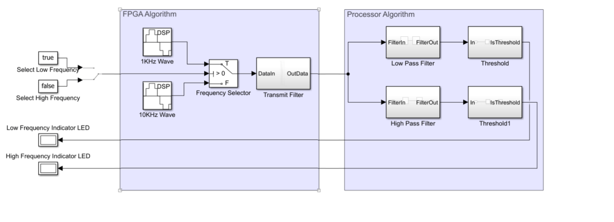 This example uses an algorithm in which the FPGA generates two sine waves at frequencies of 1 kHz and 10 kHz. A switch mechanism in the FPGA selects one of these sine waves and sends the selected signal to the processor. The processor uses a lowpass filter and a highpass filter to analyze the incoming signal and determine whether the transmitted sine wave is low or high frequency. Based on the filter outputs, the processor detects which sine wave is sent. After identifying the transmitted frequency, the processor sends the detection result back to the FPGA. The FPGA uses this information to control two LEDs: one indicates low frequency and the other indicates high frequency. The LED corresponding to the detected frequency glows.