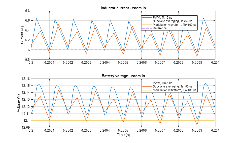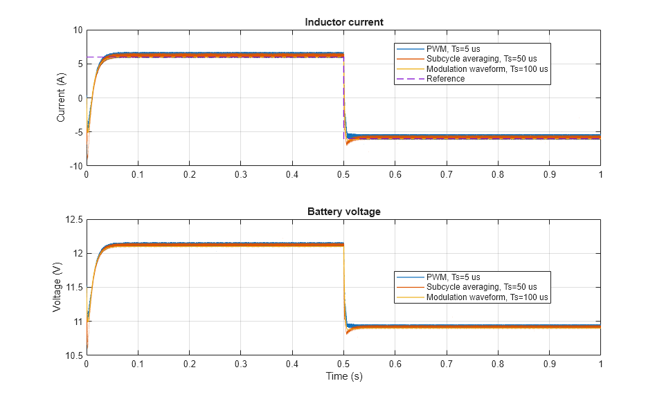 此示例展示了如何控制双向 DC-DC 转换器的电感器电流。为了调整占空比,Control 子系统使用基于 PI 的控制算法。双向 DC-DC 转换器使用平均开关。为了实现不同的保真度级别,您可以使用调制波形、平均栅极脉冲或栅极脉冲。