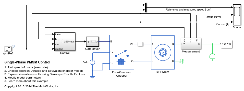此示例展示了如何控制单相永磁同步电机 (SPPMSM) 驱动装置中的转子转速。DC 电压源通过受控 H 桥为 SPPMSM 供电。Control 子系统实现转速控制策略。