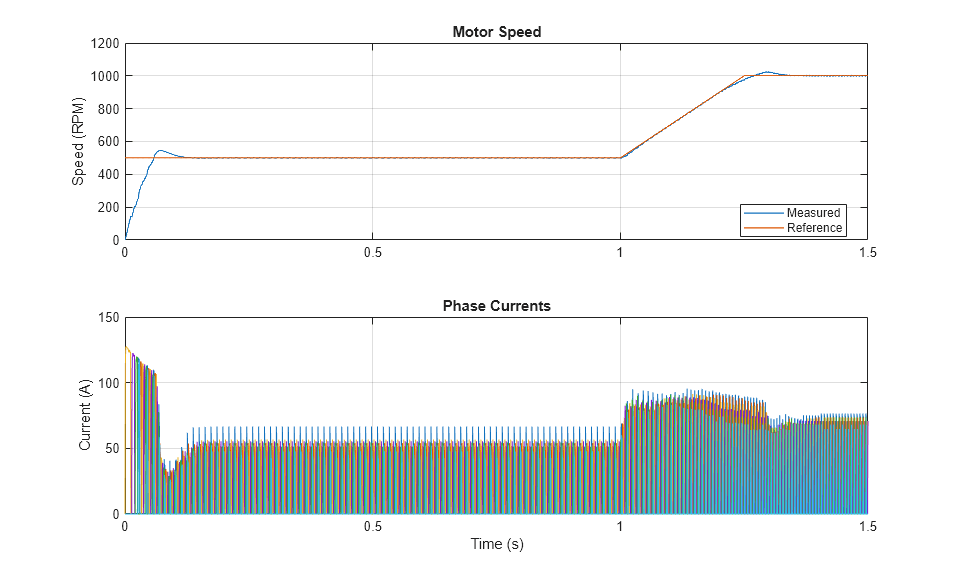 下图显示了测试中的请求转速和测得转速,以及电力驱动装置中的相电流。