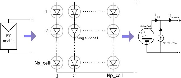 The Solar Plant block comprises Ns*Np PV modules. Each solar PV module consists of Np_cell parallel-connected strings and each string comprises Ns_cell series-connected solar cells. A Solar Cell block from the Simscape™ Electrical™ library models the solar cell strings. To specify the size of the PV module, define the number of cells, Ns_cell and Np_cell, in the modules. To replicate a commercially available solar panel, the solar PV module parameters are directly obtained from a solar panel manufacturer datasheet. For more information about manufacturer datasheet-based parameterization, see the Simscape Electrical 'SolarPanelValidation' example.