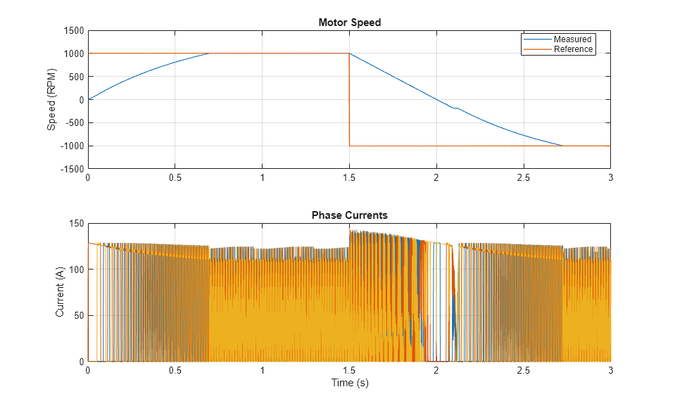 下图显示了测试中的请求转速和测得转速,以及电力驱动装置中的相电流。