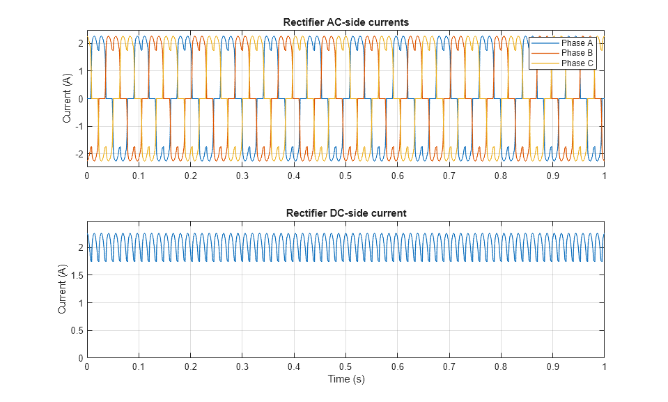 第一个子图显示了永磁同步电机 (PMSM) 生成的 AC 电流。第二个子图显示了通过电阻负载的 DC 电流。