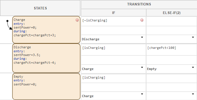 Chargestate, right-click any row in the If column and select Set Breakpoints > When Transition Is Valid. A breakpoint badge