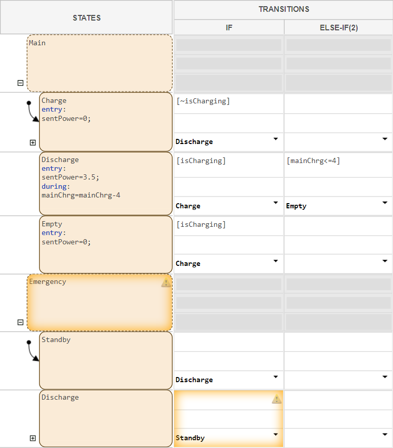 The table has two non-parallel states that represent the main and emergency batteries. Each battery has nested child states that represent operating modes for charging, discharging, running out of power, or standing by. Additionally, the batteries use these data: