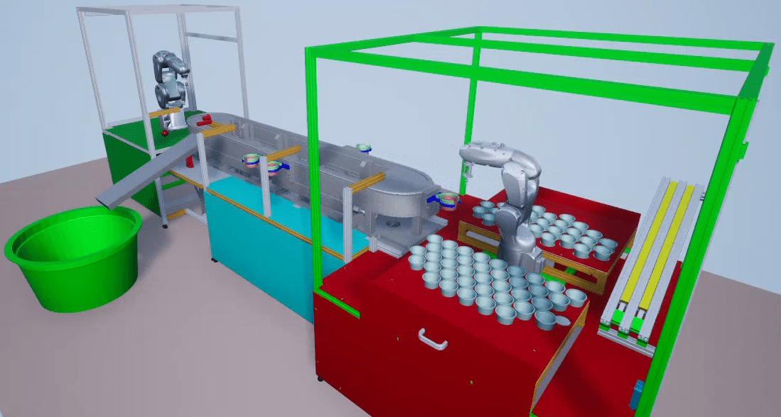 If the cup or ball supply for a robot becomes empty, the robot arm pauses operation until the supply refills.