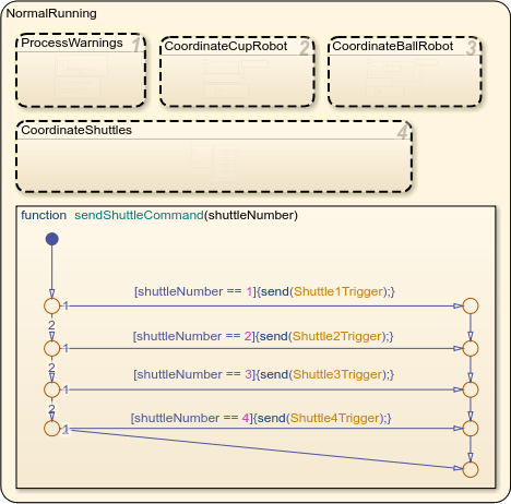 During normal operation, the chart uses the NormalRunning subchart to coordinate external commands. For example, in NormalRunning, the CoordinateCupRobot subchart prevents the cup robot from placing a cup until a shuttle is present.