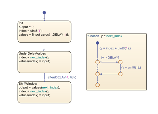 The UnderDelayValues state applies circular buffering, where the chart writes the new input and increments the index. The ShiftWindow state reads the delayed sample, introduces a one-sample delay, and closes the feedback loop.