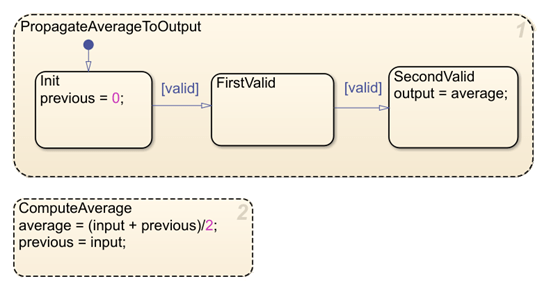 The PropagateAverageToOutput state has three child states, Init, FirstValid, and SecondValid. The Init state initializes the previous input value to 0. The SecondValid state outputs the average value.
