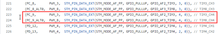 You can notice that in the PeripheralPins.c file, the pin PC_9 is mapped to TIM3_channel4 and PC_9_ALT0 is mapped to TIM8_channel4.