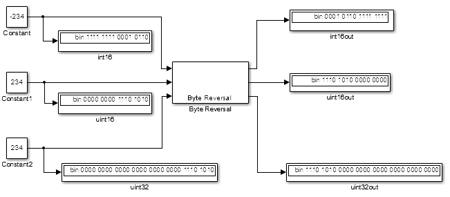 The following model shows byte reversal. In the first signal, with value -234, the low-order byte 0001 0110 is swapped with the high-order byte 1111 1111. Therefore, the signal outputs to 0001 0110 1111 1111.