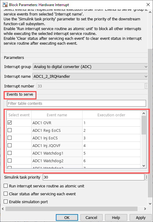 Use the Hardware Interrupt block to create an interrupt service routine (ISR) automatically in the generated code of your model to react to the events selected. The ISR executes the downstream function-call subsystem associated with event ports of the block.