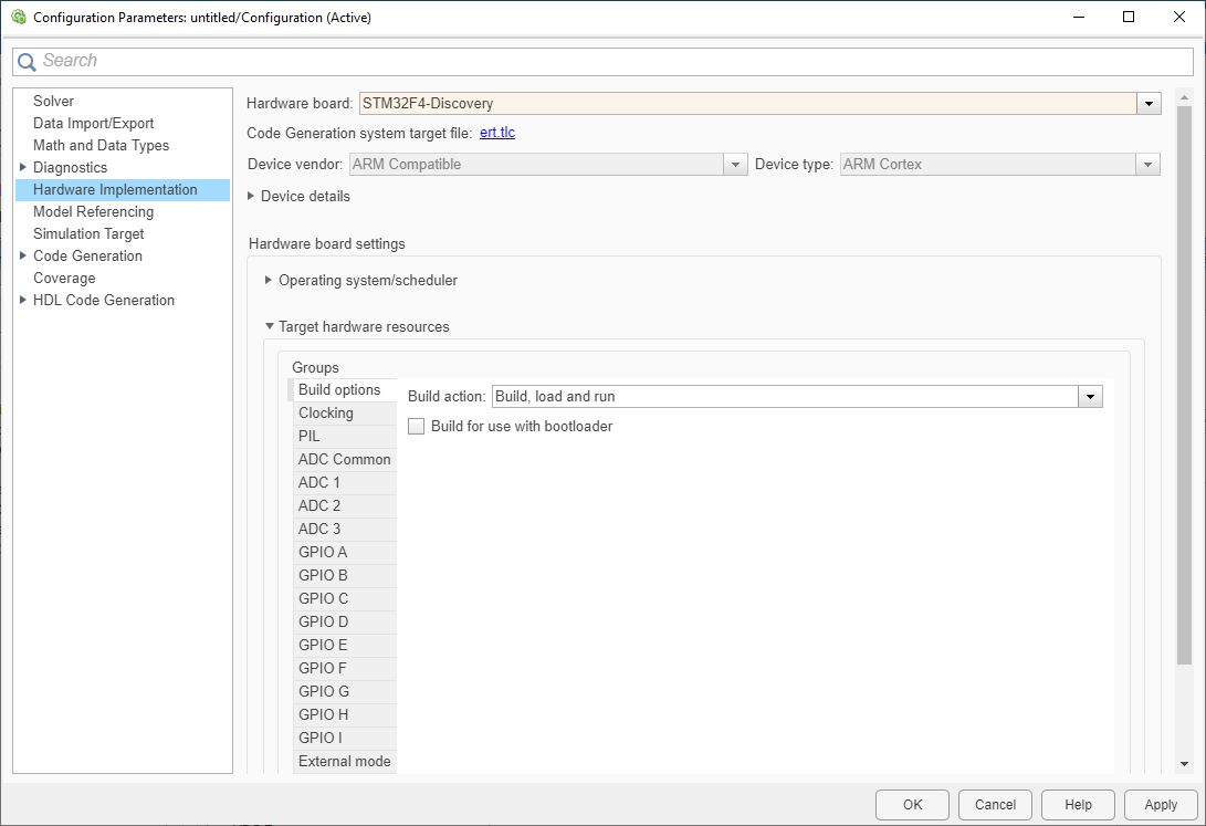 Model Configuration Parameters for STMicroelectronics STM32F4-Discovery Board