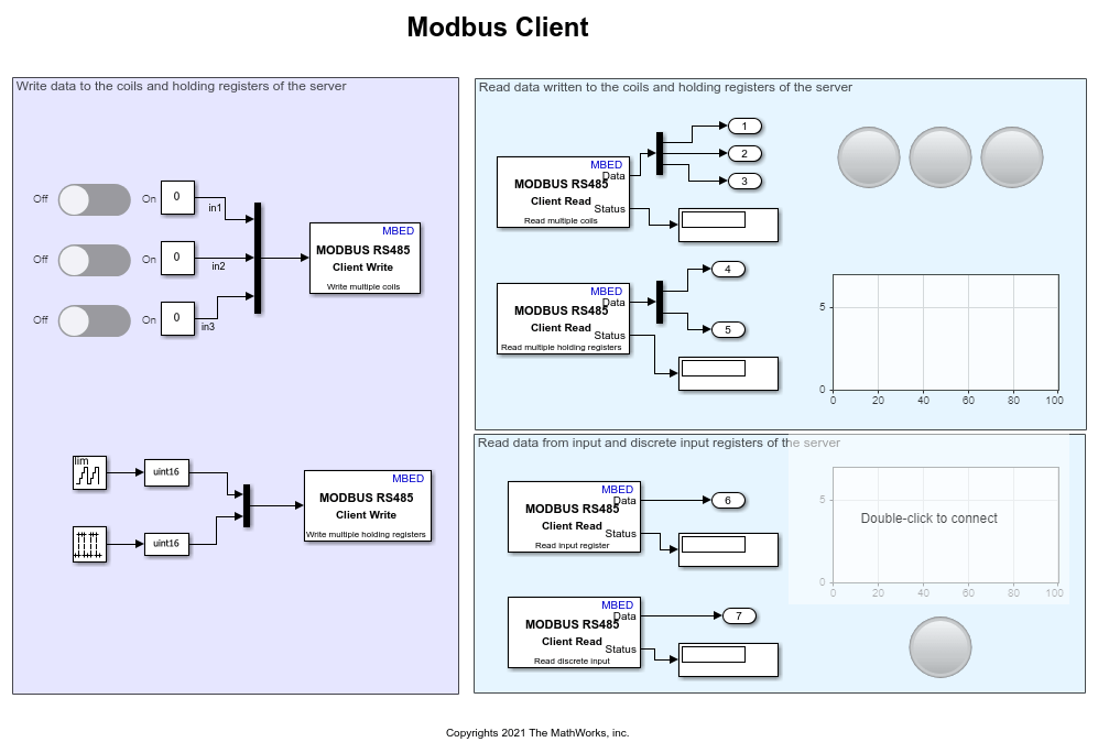 This example shows how to use the STM32™ Microcontroller Blockset to implement a MODBUS® RS485 asynchronous, serial communication between MODBUS client and server devices. The example also shows the four modes of operation: Client Read, Client Write, Server Read, and Server Write.