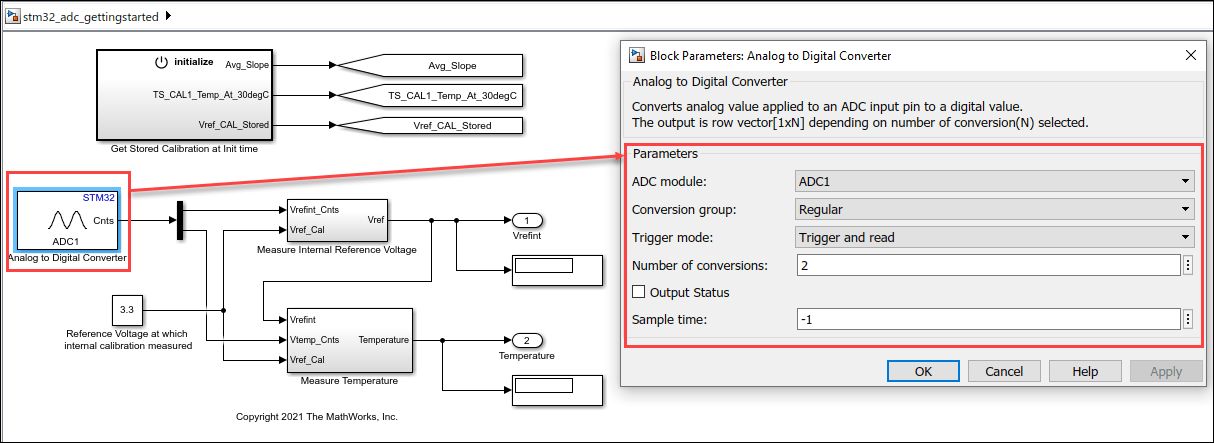 In this example you will learn how to use and generate code for Analog to Digital Converter block in Simulink model for STMicroelectronics NUCLEO-F429ZI board to measure and digitize internal reference voltage and temperature.