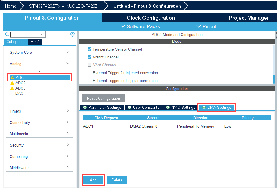 • Enable direct memory access (DMA) for ADC1 as it is sampling more than one channel and to ensure no data is missed. To enable DMA, follow following steps: