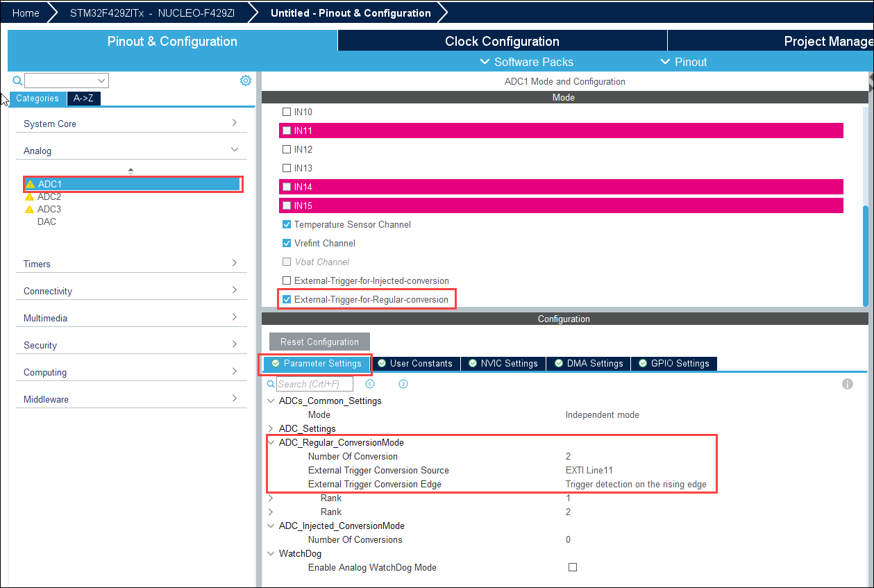 3. Configure ADC1 to start conversions from an external events: