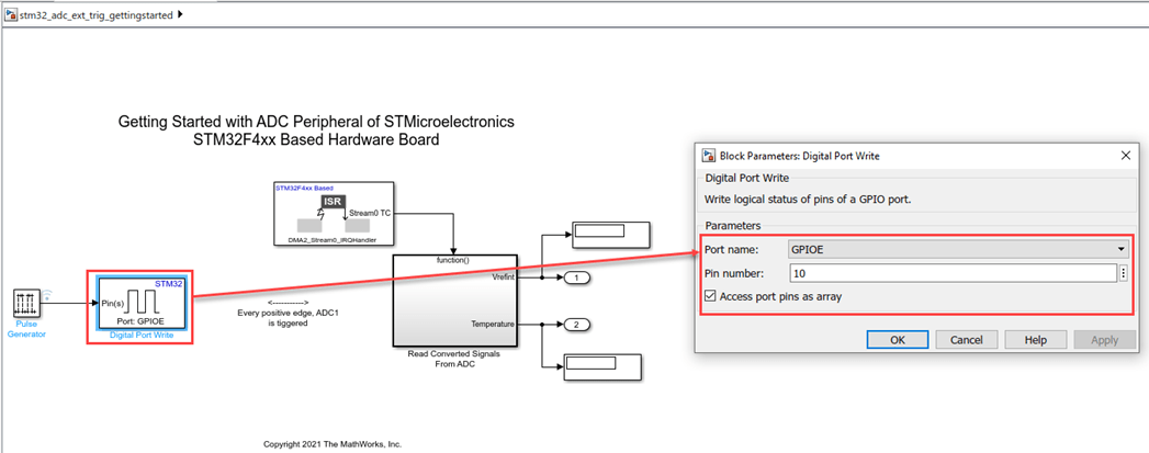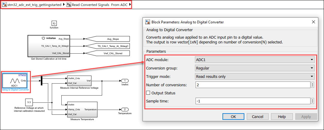 • Try running the example to read the temperature when Analog to Digital Converter block is set to Injected conversion group.