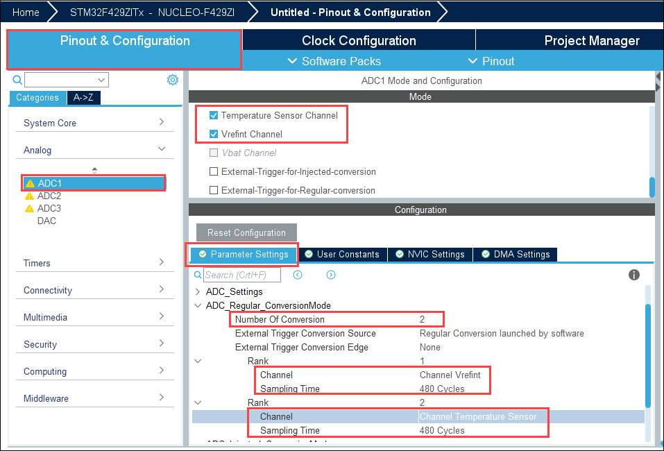 4. Perform the following configurations to enable and configure ADC1 channels to digitize Reference Voltage and Temperature: