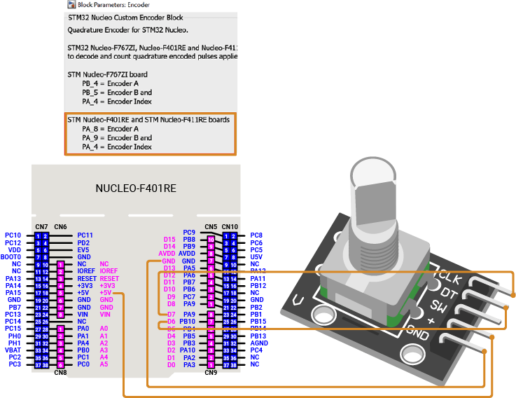 Connect Nucleo pin PA_8 to Encoder pin A (CLK).