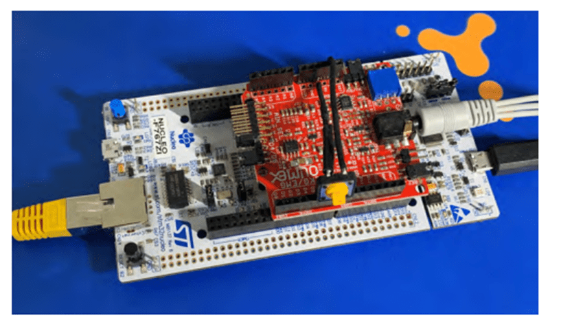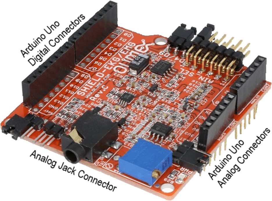 The extension board that is being used for this example is the Shield-EKG-EMG from Olimex. This board has been especially designed, with specific amplifiers and filters, to measure what are called biosignals such as electrocardiogram (ECG) and electromyogram (EMG), which is exactly what is needed for this project as ECG signals are measured.