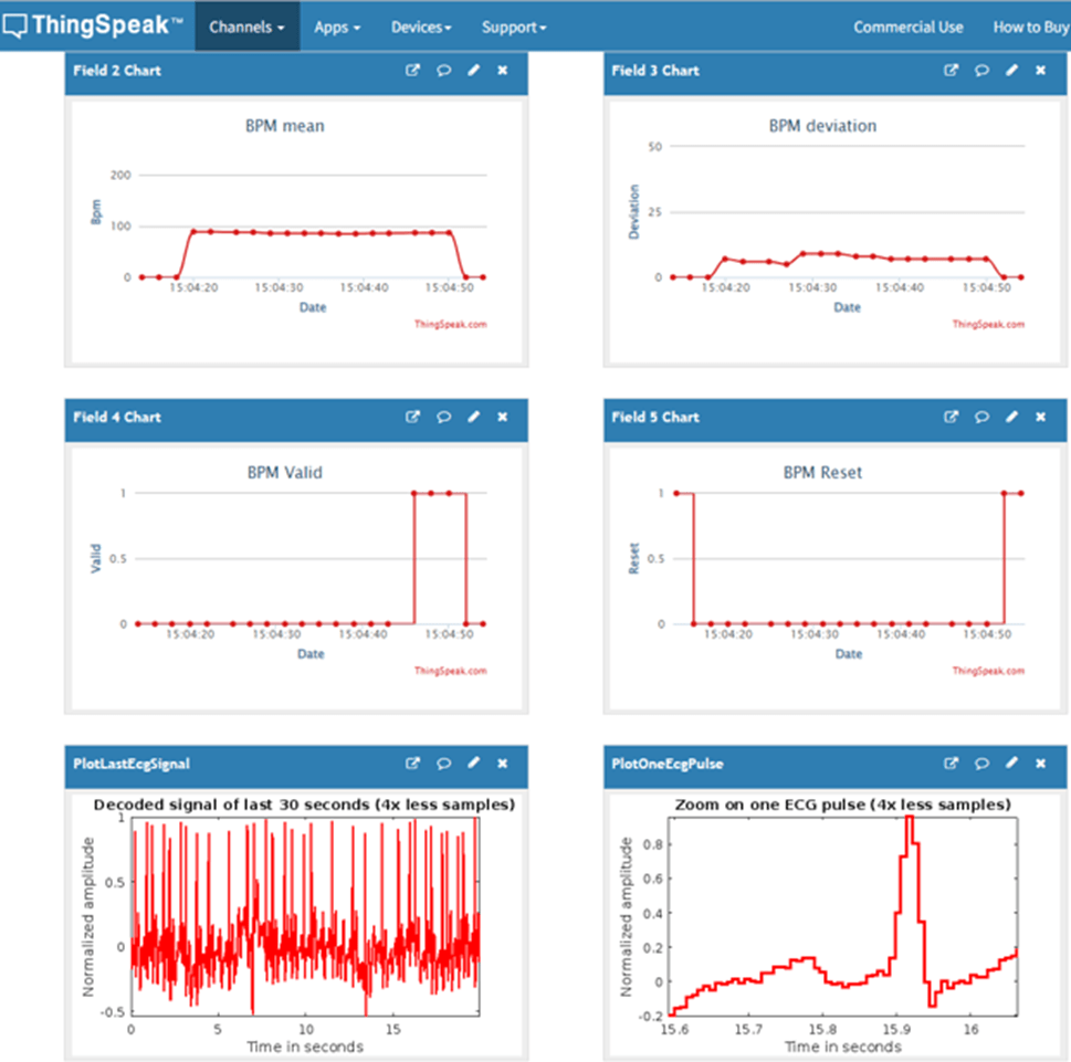 Use the M script files PlotOneEcgPulse.m and PlotLastEcgSignal.m setup the ECG signals for display on ThingSpeak. See ThingSpeak Channel BMP Charts. Then, in the View of the ThingSpeak Channel, click on “Add Visualizations” and select one of the two charts.