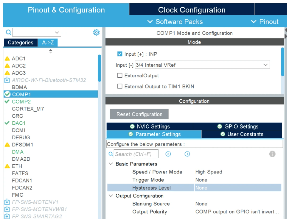 Use STM32CubeMx to specify the mode and required IOC configuration for each comparator.