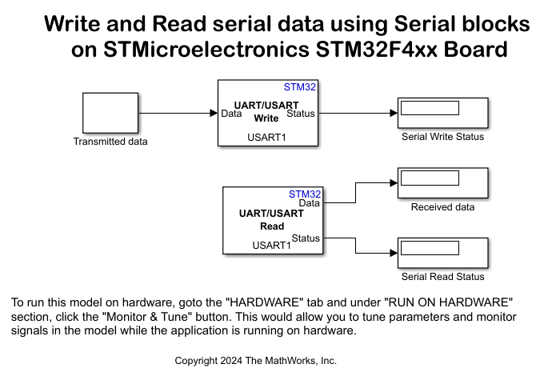 This task explains how to configure the model to write and read serial data using the USART Write and Read blocks.
