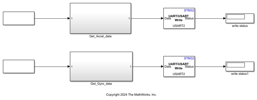 • In the second model, AccelGyroUSART, the USART Write block sends serial data to the USART1_TX serial transmit port on the STM32F401RE board. This model is deployed on the STM32F401RE board.